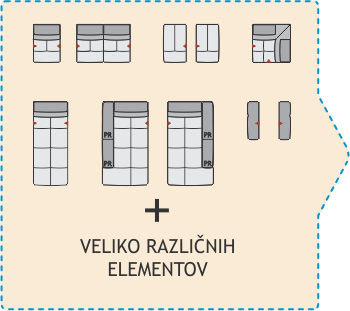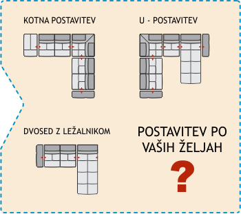 Iz posameznih elementov lahko poljubno sestavimo različne postavitve (kotna izvedba oz v obliki črke L, v obliku črke U, samostojni fotelje, dvo ali trosed, sestav po željah naročnika.