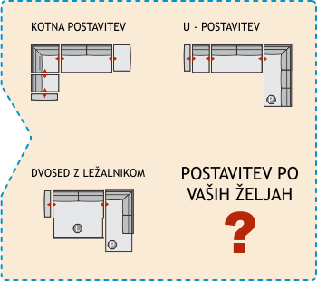 Izdelava je možna v različnih postavitvah, od kotnih izvedb, do samostojnih dvosedov in trosedov. Trosed z ležiščem je pogosta izbira kadar primanjkuje prostora, vendar kljub temu želite veliko ležalno površino z ležiščem za vsakodnevno spanje